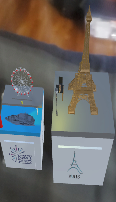 The application uses two cubes, the Merge cube and the Class cube, representing the Navy Pier and Paris, France respectively. The application uses the camera to transform the cubes into visual representations of the regions based on which cube is on camera. Each side of the cube will display the name of the place, the time based on its timezone, weather conditions of that region, and an image representing each area (A logo/flag for example). The Merge cube (Navy Pier) displays this using 12-hour time and imperial measurements while the Class cube (Paris) displays this using 24-hour time and metric measurements. On top of the cubes, there will be a 3D display to represent the things in the region (Like the Eiffel tower appearing on the Paris cube) and background sound for the specific cube will play while the cube is on display. The best thing is that both cubes can be running at the same time, so you don't have to move a cube off camera to look at the other cube.